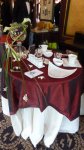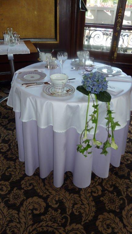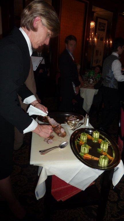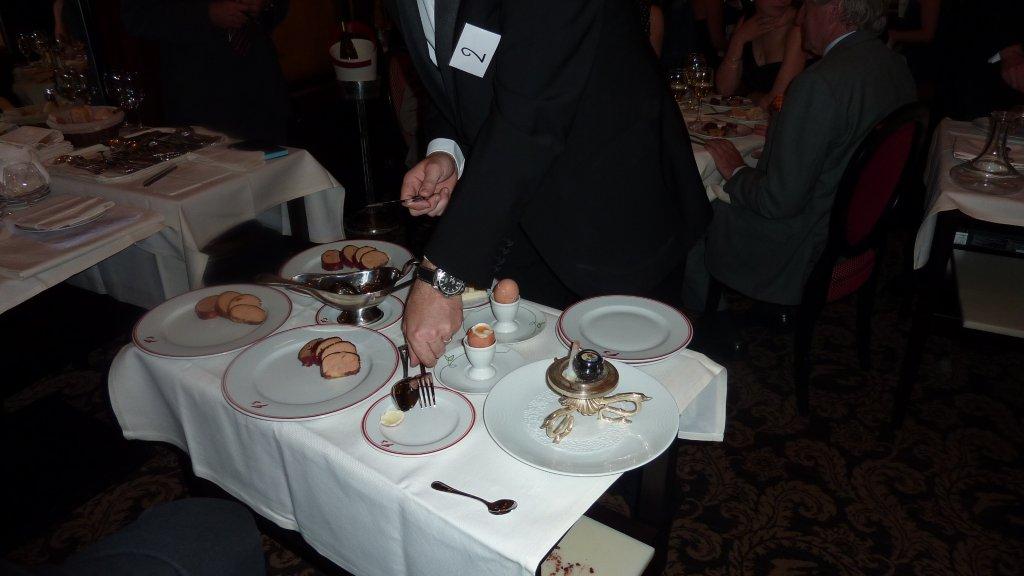 A partir d’une carte étoffée, les convives ont choisi l’œuf coque au caviar ou le lobe de foie gras au chutney de figues, qu’il fallait découper sur un bloc de glace de présentation. La simplicité apparente du service de ces deux mets demandait en réalité une prestation de service attentionnée : découper l’œuf et servir le caviar à l’anglaise, découper le foie gras en ayant trempé préalablement les lames de couteaux dans l’eau chaude. Le passage des mouillettes ou des toasts à l’anglaise ou à la française devait caractériser un service attentionné.