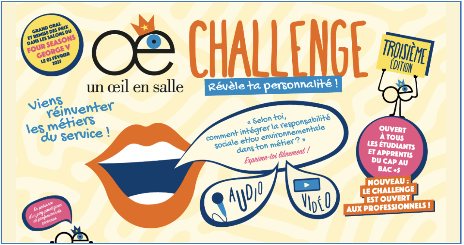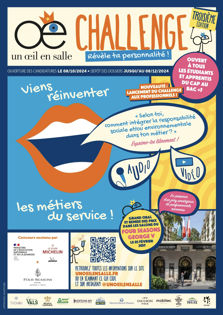 Le média professionnel Un œil en salle relance son Challenge ouvert à tous les jeunes et les apprentis du CAP au BAC +5. Nouveauté : une quatrième catégorie se destine aux professionnels. Les candidats doivent répondre à la question « Selon toi, comment intégrer la responsabilité sociale et/ou environnementale dans ton métier ? » en vidéo ou en audio. Neuf jeunes (trois catégories) et quatre professionnels seront ainsi sélectionnés et devront soutenir leurs réflexions lors d’un grand oral le 3 février 2025 dans les prestigieux salons du Four Seasons Hotel George V Paris.