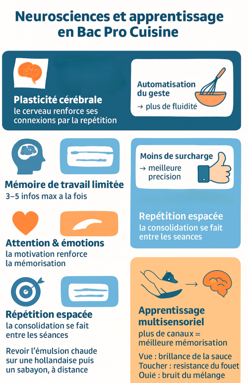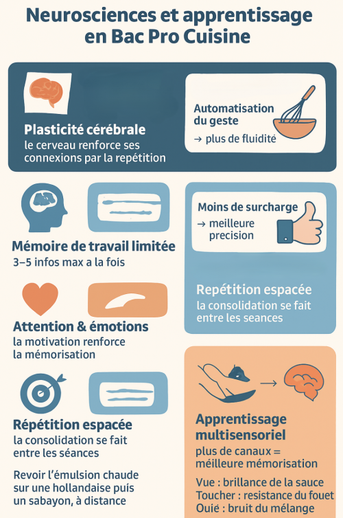 - Associer plusieurs canaux : vue + toucher + écoute (« regarde l’anatomie de la volaille, sens la résistance du couteau, écoute le bruit de la lame sur les os »).