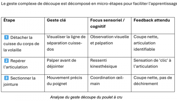 - Mise en situation réelle (ex. découpe du poulet à cru) : démontrer d’abord les 3 premières étapes, puis faire un « geste miroir » sans ustensile, en décrivant à voix haute.